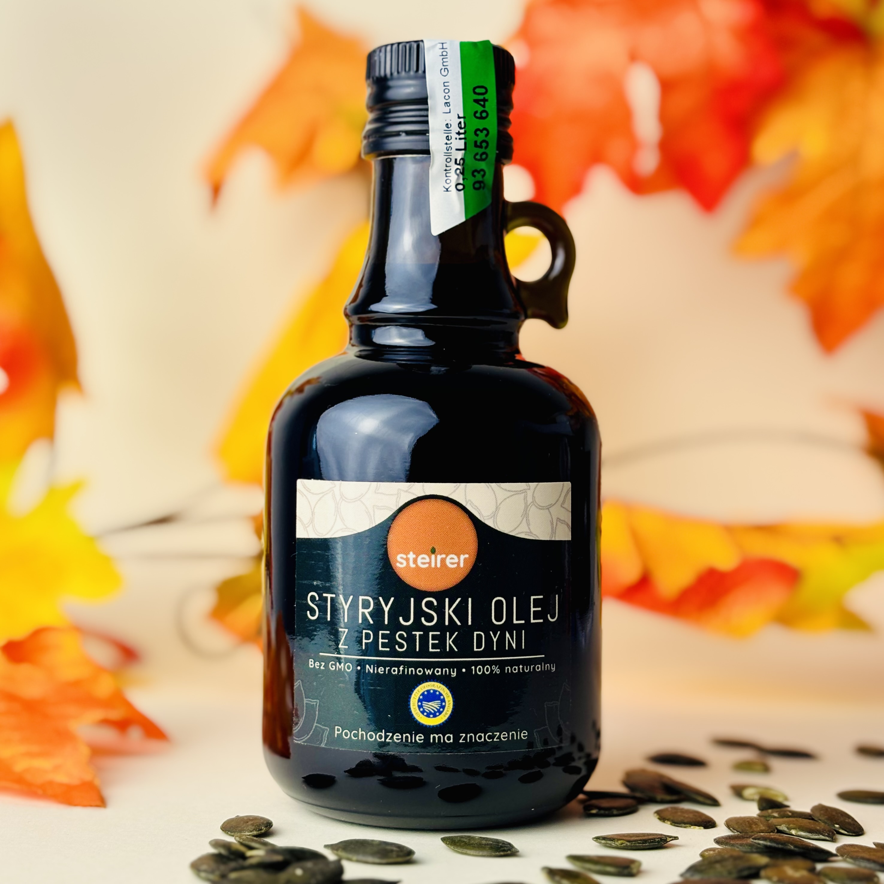 Styryjski olej z pestek dyni wyróżnia się najwyższą światową jakością, tradycją oraz certyfikacją. Dzięki restrykcyjnym wymogom produkcji, nałożonych przez instytut certyfikacji, olej ten cechuje wyjątkowa intensywność smaku i aromatu oraz potwierdzone działanie prozdrowotne.